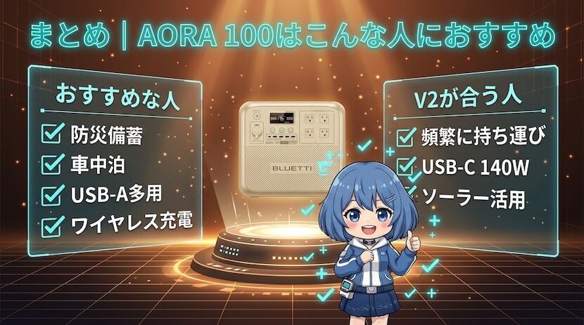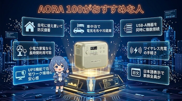 結論として、AORA 100は「自宅での防災備蓄」「車中泊」「据え置きメインの電源確保」に向いた、安心感の高い1台です。