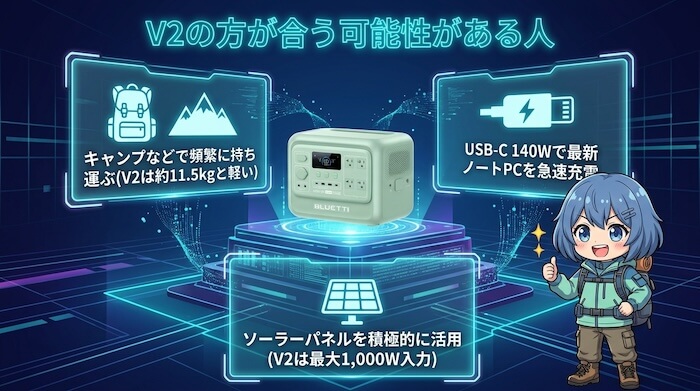 V2を選ぶべき人:持ち運びを頻繁にする、ソーラー充電を強化したい、USB-C 140WでノートPCを急速充電したい