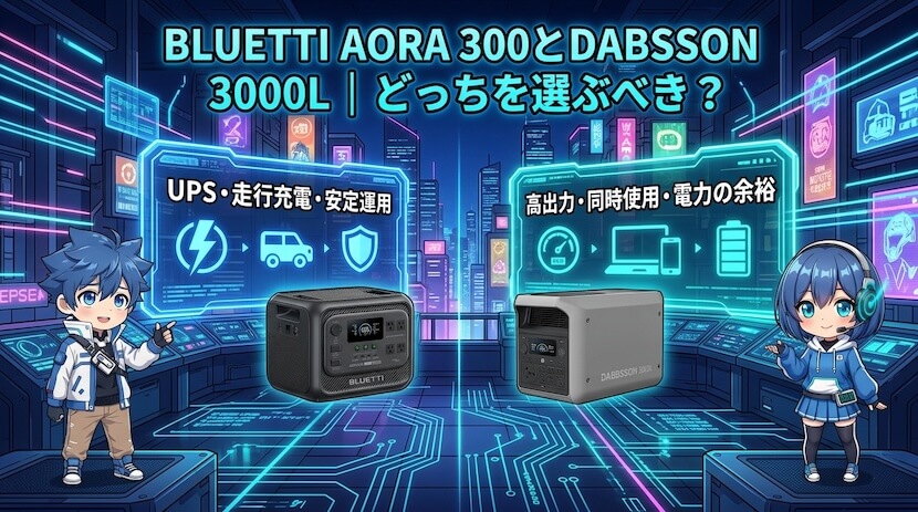 AORA 300とDABBSSON 3000Lは、同じ3000Whクラスでも「安定感重視」か「出力の余裕重視」かで方向性が大きく異なるモデルです。