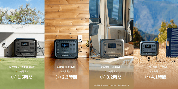 - 最速1.6時間でフル充電(AC+ソーラー)