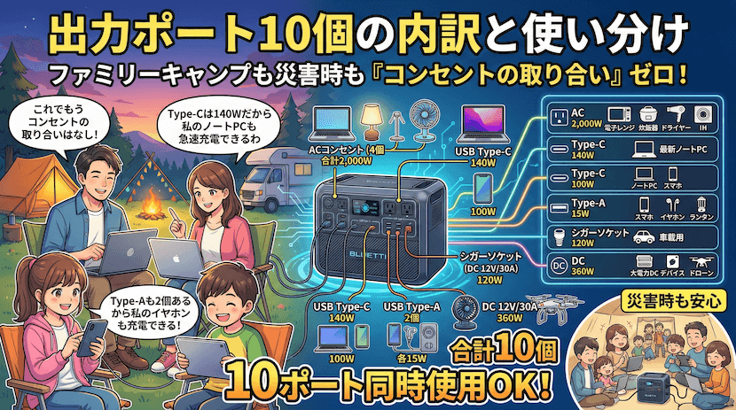 - 定格出力2,000W+電力リフト4,000W → 日常家電のほとんどに対応