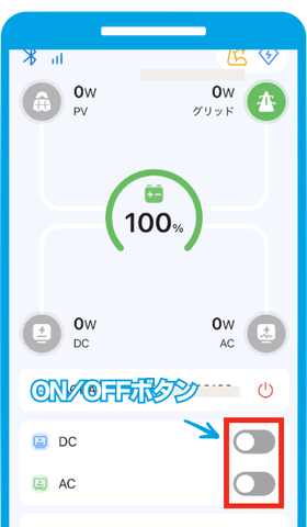個人的に一番使う機能がこれです。管理画面のAC出力・DC出力のボタンをタップするだけで、遠隔でON/OFFを切り替えられます。