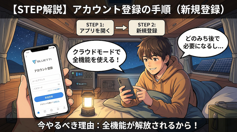 Bluetoothモードだけならアカウント不要ですが、クラウドモードで全機能を使いたいなら登録しておきましょう。