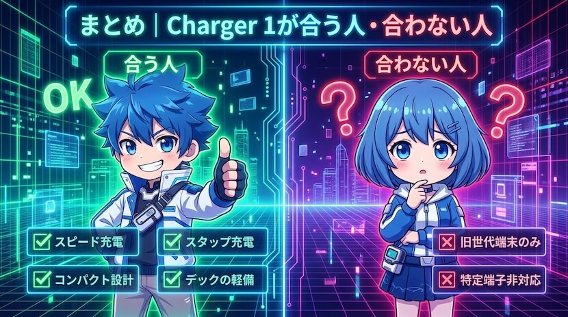 手軽さとコスパを重視するならCharger 1、充電速度と拡張性まで求めるならCharger 2が最適です。